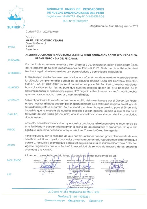 Compañeros: Hemos enviado una carta a la AANEP con el fin de que sus empresas agremiadas acojan el pedido de nuestros afiliados para que el desembarque por el Día del Pescador se reprograme para el 27 de junio